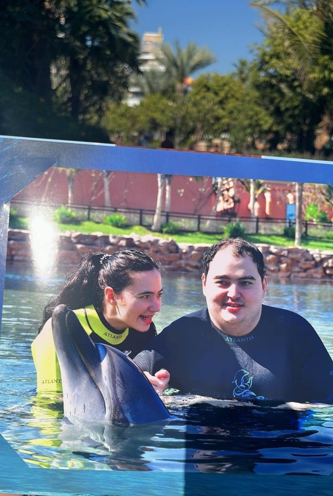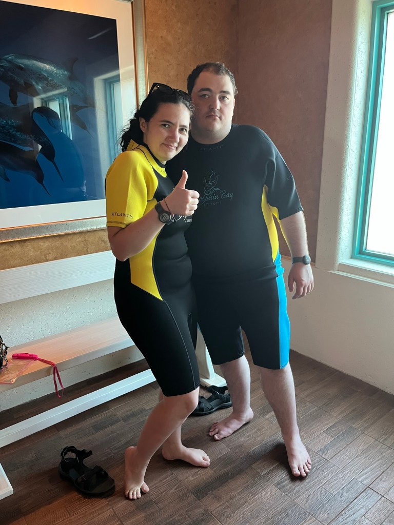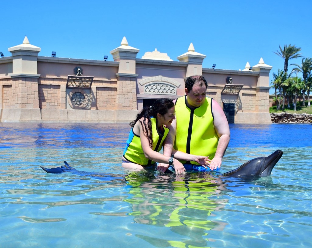 Streda bol náš posledný deň v Dubaji, a na pláne sme mali ešte plávanie s delfínom v Atlantis. Pôvodne som chcela ísť do delfinária bližšie k ubytovaniu, ale keď som zistila, že tam 20-minútový zážitok stojí neuveriteľných 600 €, rozhodla som sa pre Atlantis. Tam sme vďaka polovičnej zľave pre ZŤP a ich sprievodcov mali hodinu kúpania s delfínom len za 200 € pre oboch. Navyše, keďže sme tam boli už druhýkrát, dali nám ďalšiu zľavu.