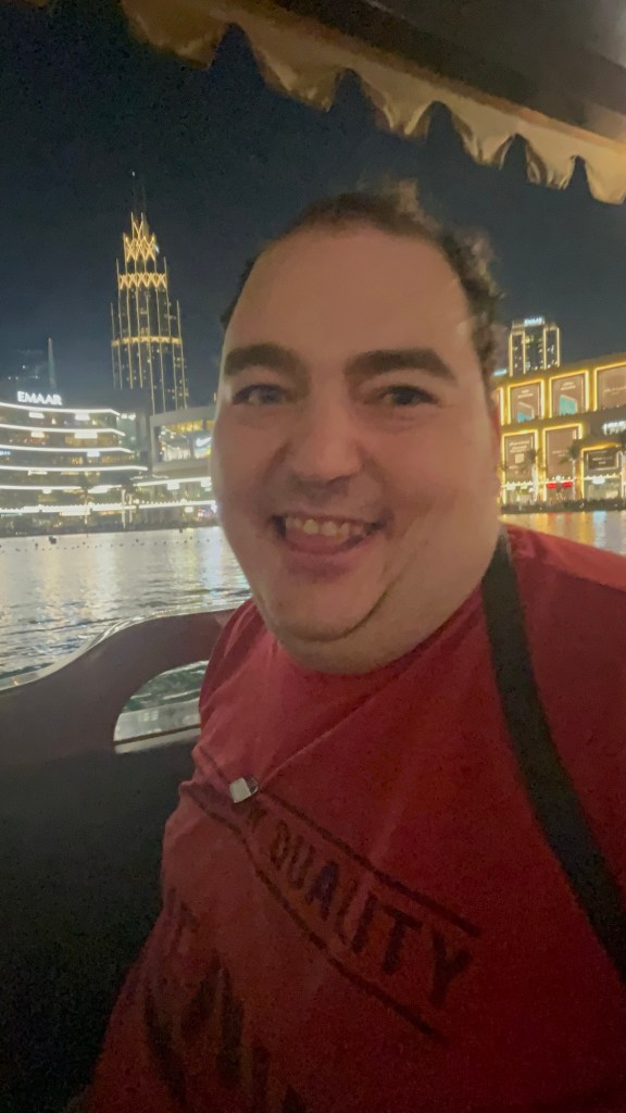 Po Atlantis nás čakala ďalšia nádherná skúsenosť – večerná plavba loďkou pri dubajskej spievajúcej fontáne. Naša rezervácia bola na 21:45, no zle som odhadla čas, a tak sme na miesto dorazili skôr. Keď som im vysvetlila, že Branko je autista, pustili nás na loďku hneď, bez čakania.